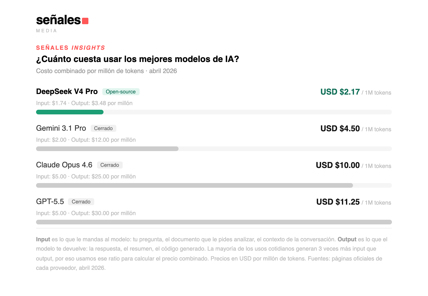 Si tu empresa usa IA a escala, el precio por millón de tokens es el número que más impacta tu presupuesto. Aquí están los cuatro modelos frontier de hoy, ordenados por costo para ti.