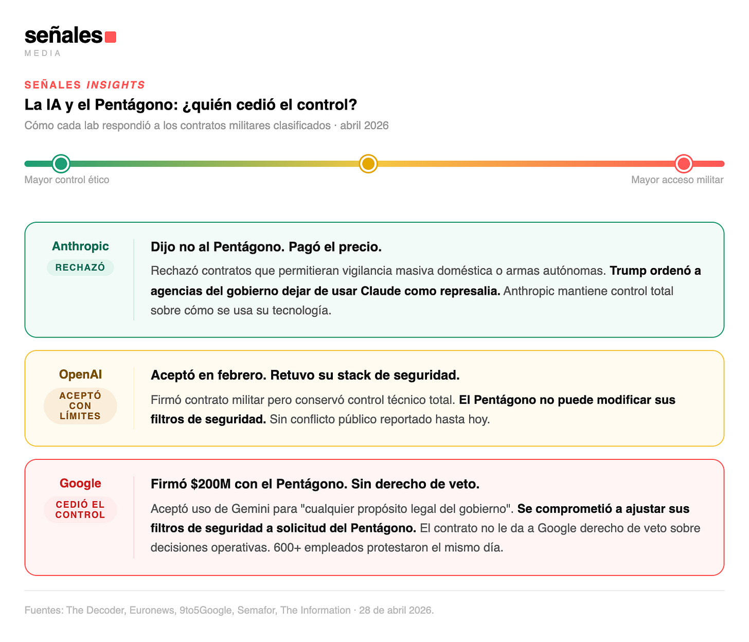La pregunta para un CEO en México: Anthropic rechazó contratos del Pentágono por razones éticas. OpenAI los aceptó pero mantuvo control sobre su seguridad. Google los aceptó y cedió ese control. Tres posiciones distintas sobre la misma pregunta. Si las herramientas de IA que usa tu empresa tienen política exterior propia, eso ya es parte del due diligence que nadie está haciendo todavía.