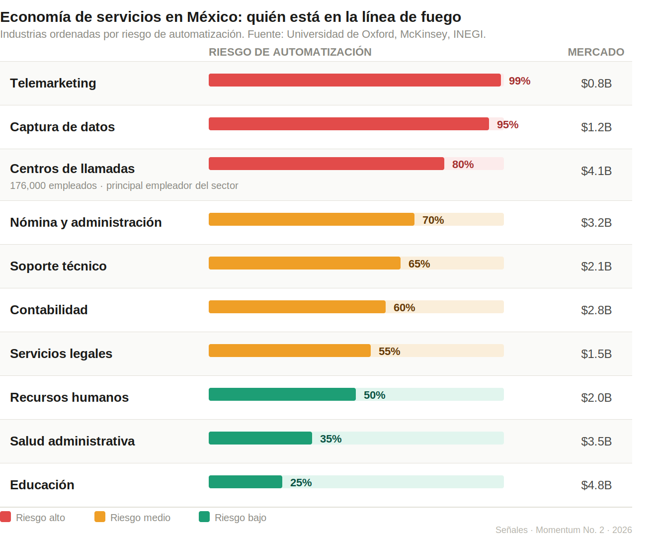 › Stanford ubicó esta semana a América Latina en exposición media a la automatización. El problema es que el 58% del Producto Interno Bruto de México viene de servicios. Esa combinación es la más peligrosa: suficientemente expuesta para sentir el impacto, insuficientemente preparada para capitalizarlo.